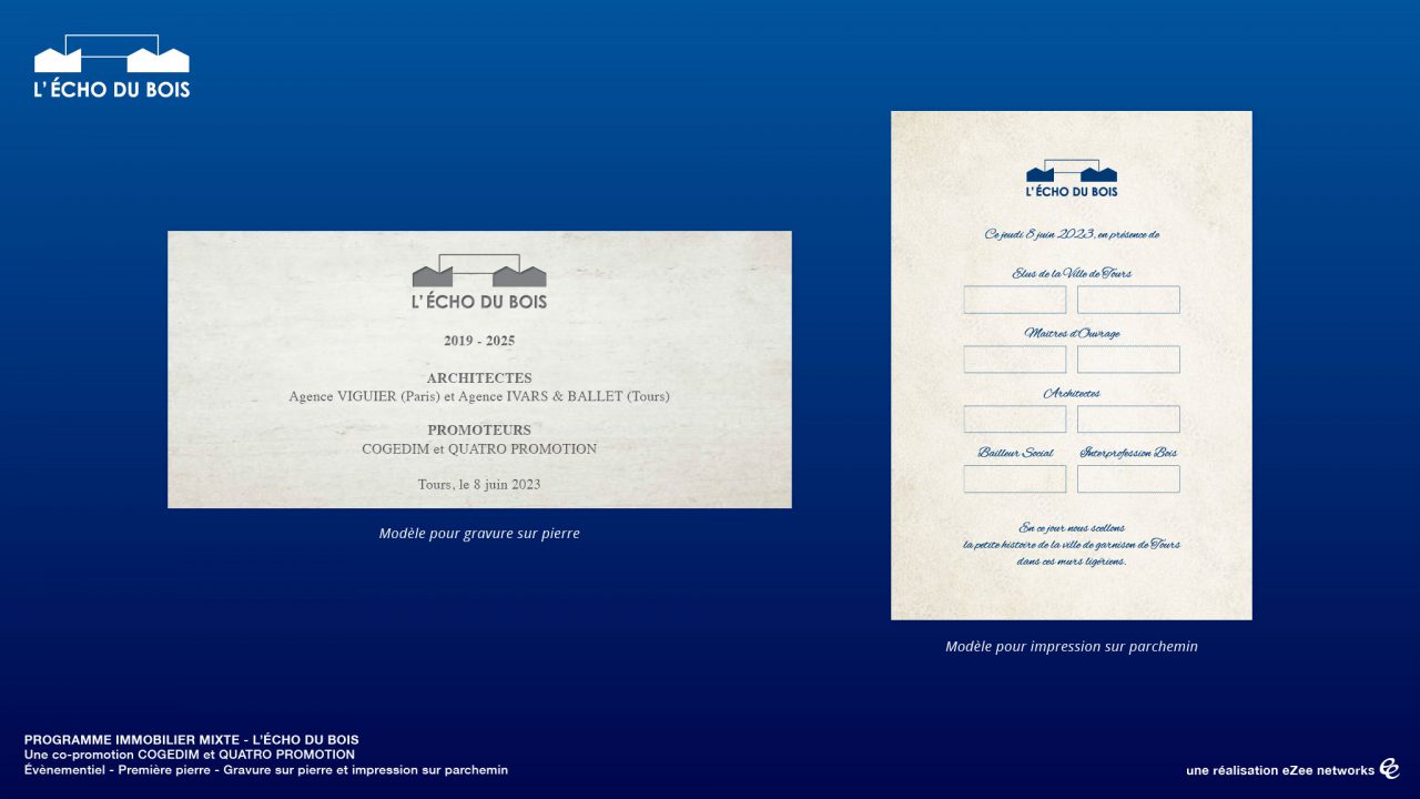 Pour le programme immobilier « L’Écho du Bois » à Tours, le promoteur Quatro Promotion nous a sollicités pour développer une page web dédiée au programme, publier des articles relatifs au projet sur le web (site internet et réseaux sociaux), réaliser un habillage vitrines et les éléments graphiques nécessaires à la présentation événementielle de la pose de la première pierre.